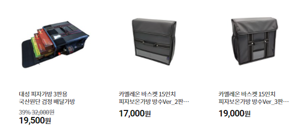 피자 가맹점 있는 업체들은 거의 필수품. 피자는 진짜 배달하기 빡시고 어려운 제품이라 조금만 기울여져도 피자가 쏠리고, 식고, 뚜껑에 붙고 난리나는데요. 피자 가방은 그걸 어느정도 막아주고 보온 유지를 시켜줍니다. 너무 다배차 하지 않는 이상은 피자 식었다는 클레임은 덜 들어오게 해주죠.