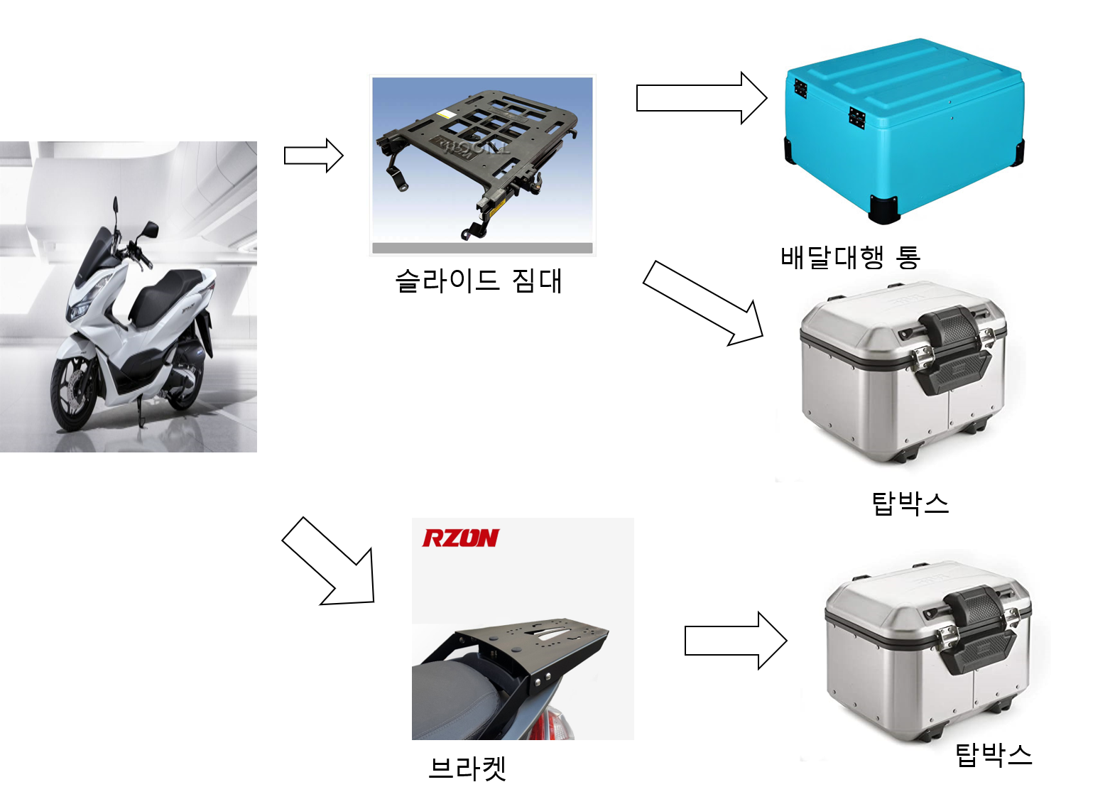 배달통을 pcx에 고정시켜주는 부품과 사용할 배달통(딸통)을 선택하는게 제일 먼저입니다. 이게 없으면 배달을 못하죠.